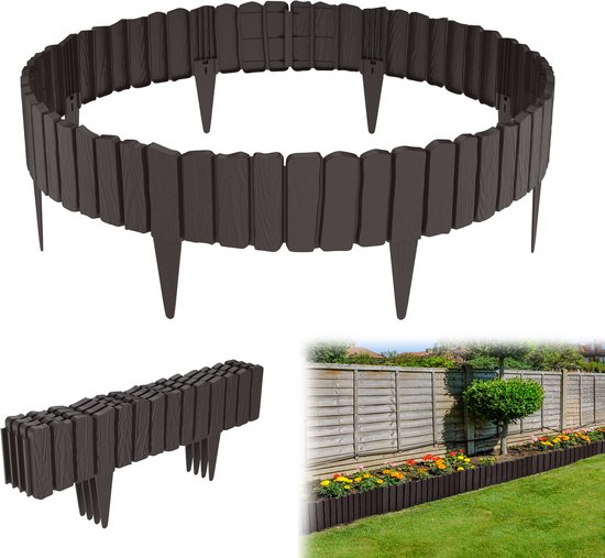Lot de 8 : 8 panneaux de clôture., 16 piquets. Bordure de jardin Rotin Aspect Bordure de pelouse Bordure de gazon... Taille d'une seule plaque de clôture (longueur x largeur x épaisseur) : 57 x 12,5 x 1 cm (partie visible). Ainsi, vous pouvez facilement créer des délimitations claires ou des accents décoratifs Design élégant effet bois : avec une hauteur de 12,5 cm et un aspect bois très réaliste, cette clôture de jardin ajoutera un charme naturel à votre espace extérieur. Cette manipulation simple permet des changements de conception spontanés et fait de la clôture la solution idéale pour les locataires ou tous ceux qui souhaitent réorganiser leur jardin régulièrement Contenu de l'emballage : Lot de 4 : 4 panneaux de clôture., 8 piquets. Les éléments flexibles peuvent être posés aussi bien en lignes droites qu'en formes courbes et combinés les uns avec les autres à volonté. Adaptable et flexible : la construction innovante permet une liberté de conception individuelle dans votre jardin. Le grain finement imité et les couleurs chaudes créent une atmosphère harmonieuse pour tous les styles de jardin, qu'ils soient modernes ou campagnards. GardenPlast® WoodPalisade Bordure de pelouse et de parterre TRMLBE Bordure de pelouse en plastique Palissade de jardin avec aspect bois Bordure de pelouse Pierre de bordure Marron (LxH) : 28cm x 24cm - 30 pièces 8,4M Caractéristiques techniques : Matériau : plastique PP Motif : aspect grain de bois Couleurs : anthracite/marron/gris. Vous obtenez ainsi un aspect soigné durable pour les parterres, les chemins ou les bordures de terrain Grâce à sa malléabilité flexible, elle s'adapte facilement aux lignes droites et incurvées, facile à installer et parfaite pour l'aménagement de jardin personnalisé. La couche d'imitation bois de qualité supérieure offre une esthétique rustique sans entretien du bois véritable. Bordure De Jardin En Bois à Planter WOLTU Clôture De Pelouse Décorative En Bois, Bordure De Jardin Flexible, Palissade De Jardin Extérieur, Bordure De Parterre Pour Gazon, Plate-Bande, Potager, Verger, 203x30 Cm, Anthracite Bordure Arbre Bois Ainsi, vous combinez l'esthétique du bois avec la praticité des plastiques modernes Longueur totale : lot de 4 - 2,4 m, lot de 8 - 4,8 m. Les éléments peuvent être assemblés rapidement et sans outils et tout aussi faciles à déplacer ou à étendre si nécessaire. Utilisation polyvalente : que ce soit comme bordure de parterre décorative, bordure de potager pratique ou délimitation élégante de chemin, cette clôture offre d'innombrables possibilités d'utilisation. La résistance aux UV empêche la décoloration, tandis que la texture imperméable et résistante à la corrosion assure une longue durée de vie.
